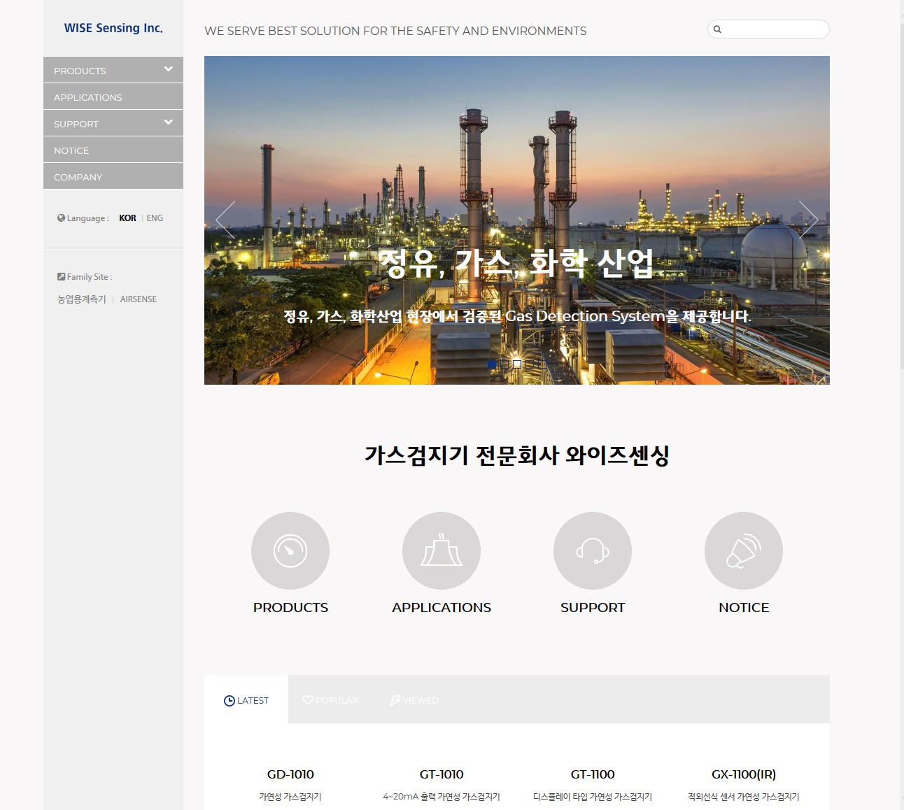 (주)와이즈센싱은 25년이상 가스측정 분야에서 기술혁신 및 최고의 품질을 추구하고 있습니다. 제품의 특성에 따라 3개의 영업팀과 기술팀, 지원팀으로 구성되어 있으며, 최신의 생산설비 및 실험설비를 갖추고 국내 및 해외에 30여개의 대리점을 보유하여 고객서비스를 하고 있습니다. 우수한 제품설계, 생산, 에프터 서비스 및 제품 유통망을 유기적으로 연결한 독자적인 조직시스템을 가지고 있으며 주요시장으로는 OIL&GAS, 석유화학, 반도체, 화학, 식음료, 자동차, 농업, 및 환경 등 분야이며, 전 산업공정의 가스측정, 분석 및 제어에 폐사의 제품이 사용되고 있습니다. (주)와이즈센싱은 지속적인 고객의 요구를 충족하고자 최선을 다하며, 고객만족을 위해 역할을 다할 것입니다. 축적된 기술 노하우를 바탕으로 고객이 요구하는 제품의 설계와 품질향상에 매진하고 있으며, 또한 고객과의 상호관계를 지속적으로 발전시켜 고객이 감동할 수 있도록 우리의 새롭고 흥미로운 도전은 계속될 것입니다